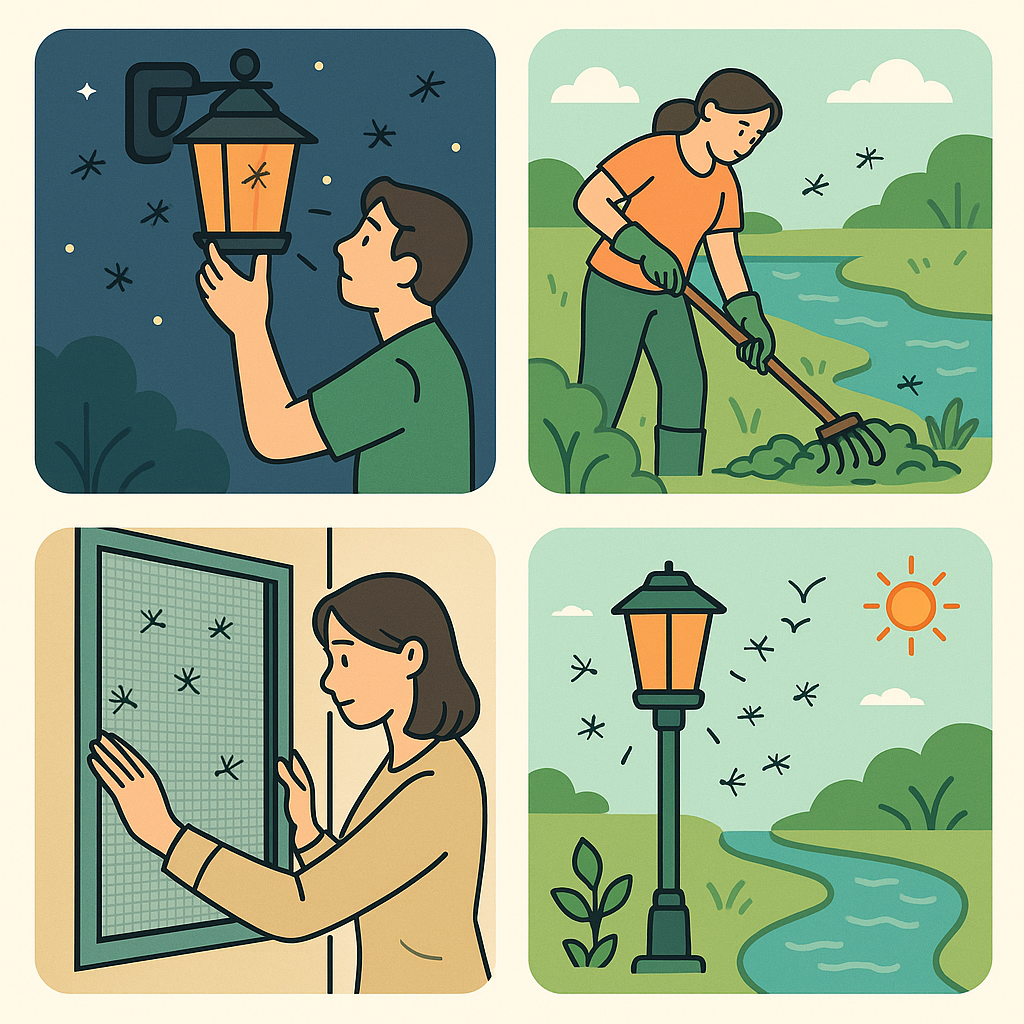 하루살이 퇴치의 첫걸음은 야간 조명을 줄이는 것입니다. 물 쪽으로 향하는 조명을 조정하거나, 조명의 색상 스펙트럼을 변경하여 하루살이 접근을 줄일 수 있습니다.