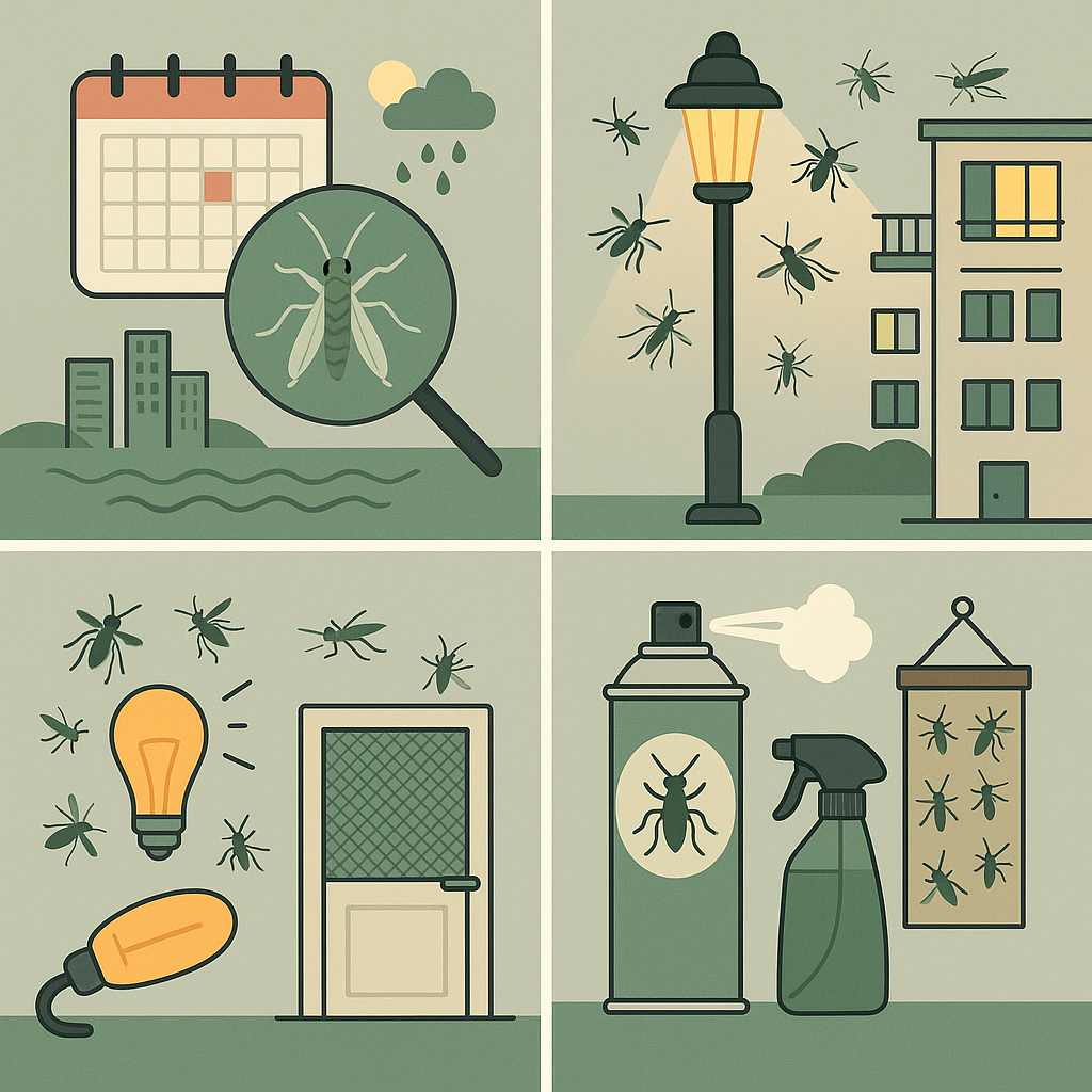 5월부터 7월까지, 기온이 20도 이상이고 습도가 높은 시기에 동양하루살이의 출몰이 극대화됩니다. 특히 비가 많이 온 뒤 급격히 번식합니다.