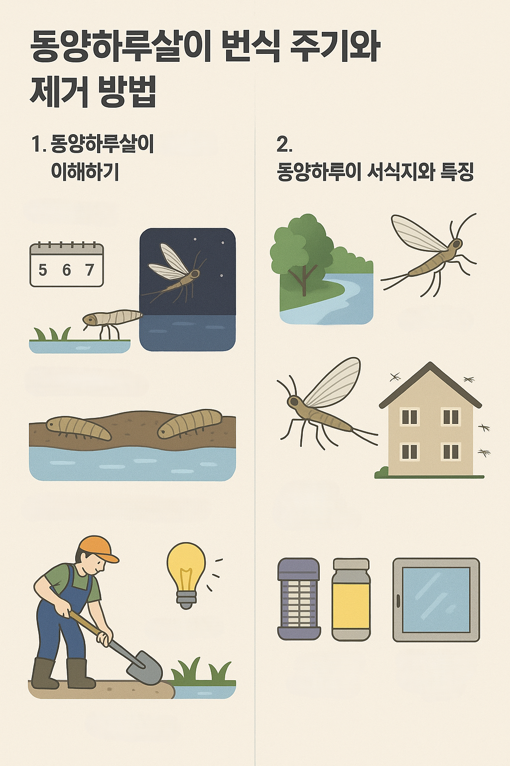 동양하루살이는 봄철과 여름철에 특히 많이 출몰하는 곤충으로, 짧은 생애를 가지지만 번식력은 매우 강합니다. 이 글에서는 동양하루살이의 번식 주기와 생태를 상세히 알아보고, 효과적으로 제거할 수 있는 방법까지 함께 소개합니다.