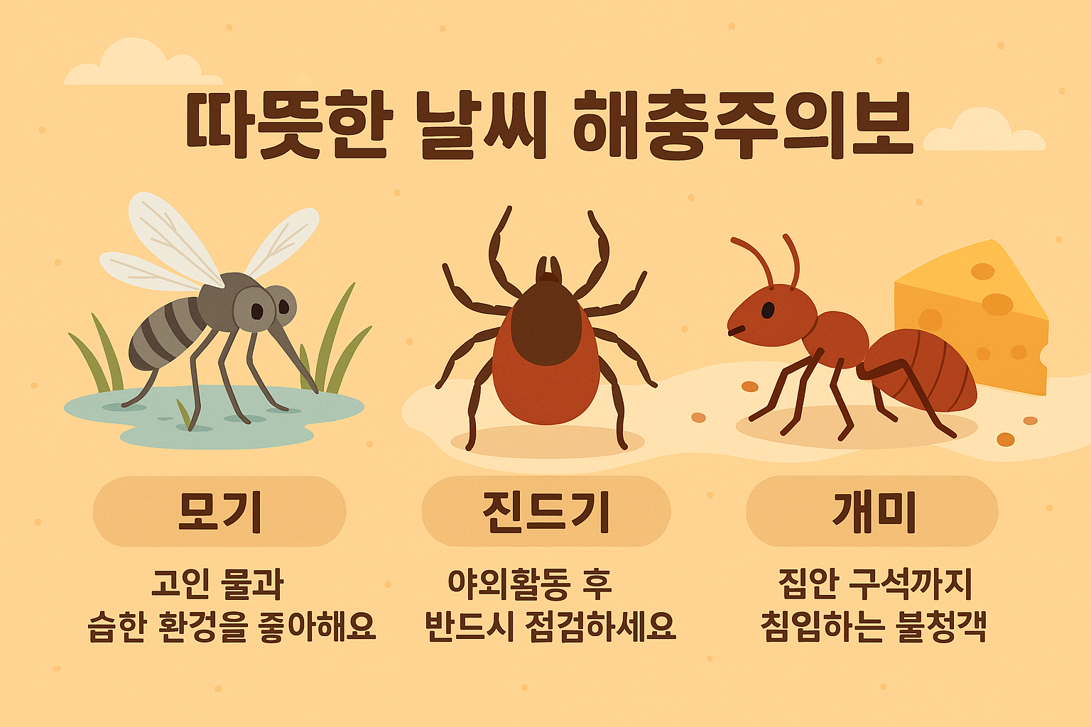 모기, 진드기, 개미는 각각의 특징에 맞춘 예방이 중요합니다. 우리 가족의 건강과 쾌적한 생활을 위해, 오늘 집 안팎을 꼼꼼히 점검하고 해충 퇴치 계획을 세워보세요.