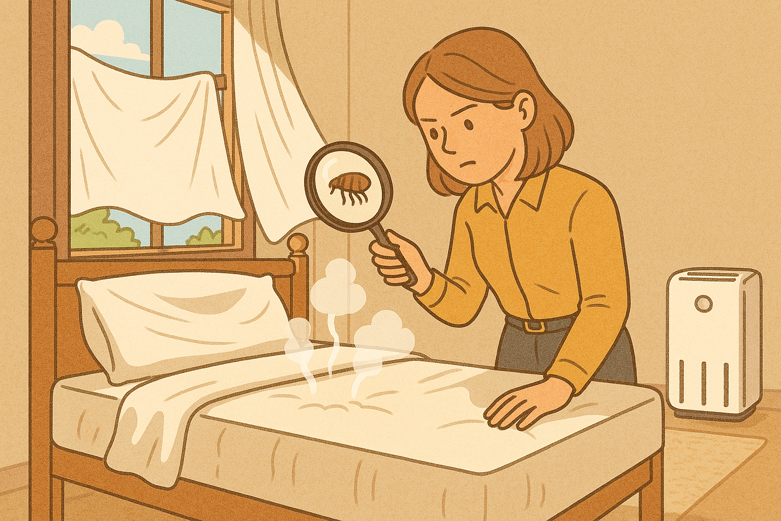 침대는 사람의 체온과 땀이 스며들어 있어 벼룩이 숨어들기 좋은 장소입니다. 매트리스 틈, 베개 속, 이불 속의 미세한 공간이 알과 유충의 번식지가 됩니다.