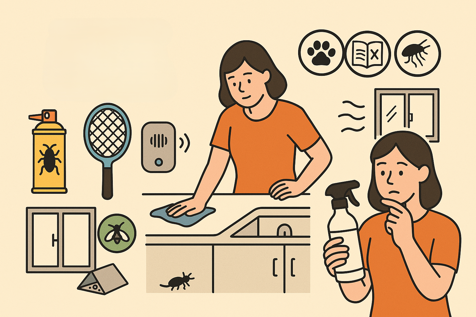 - 개, 고양이 등 반려동물이 있는 집은 천연성분 또는 무독성 제품만 사용해야 합니다. 일부 기피제나 초음파 장치는 반려동물에게 스트레스를 줄 수 있습니다.